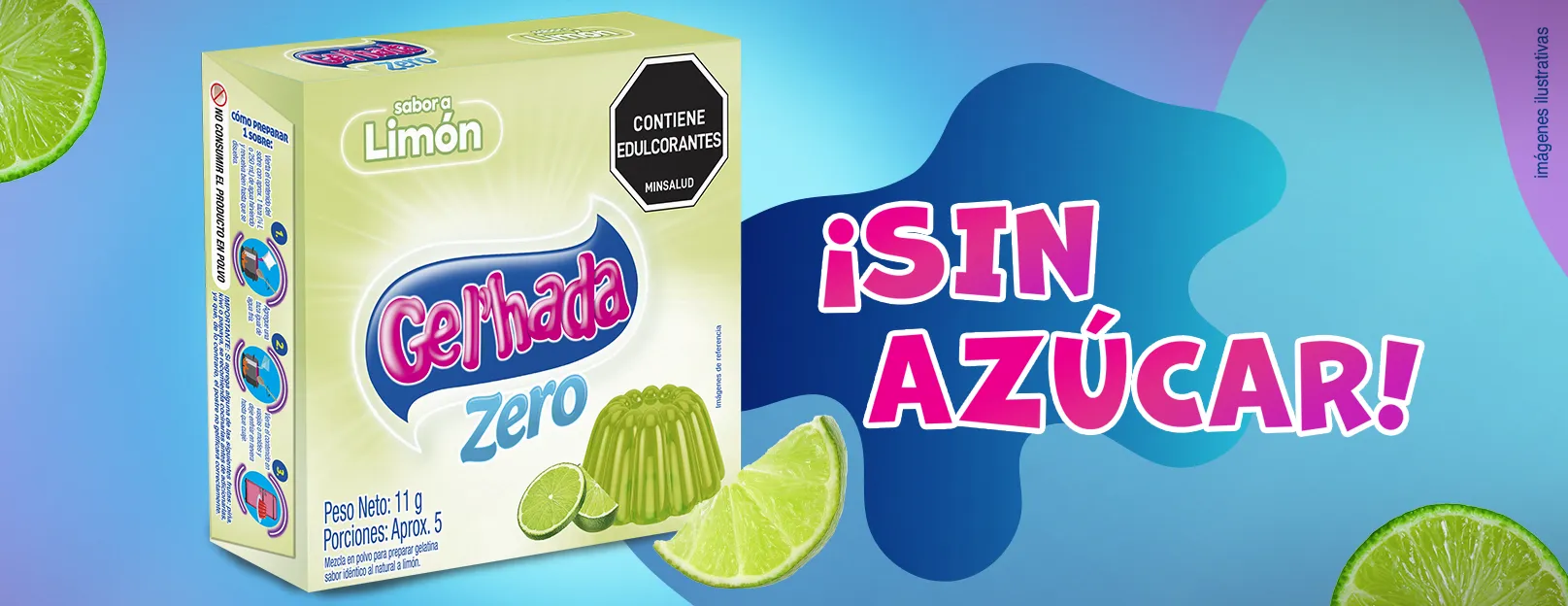 Es la versión de gelatina a la que no añadimos azúcar en su proceso de producción. Está endulzada con sucralosa, un endulzante que no aporta calorías.